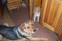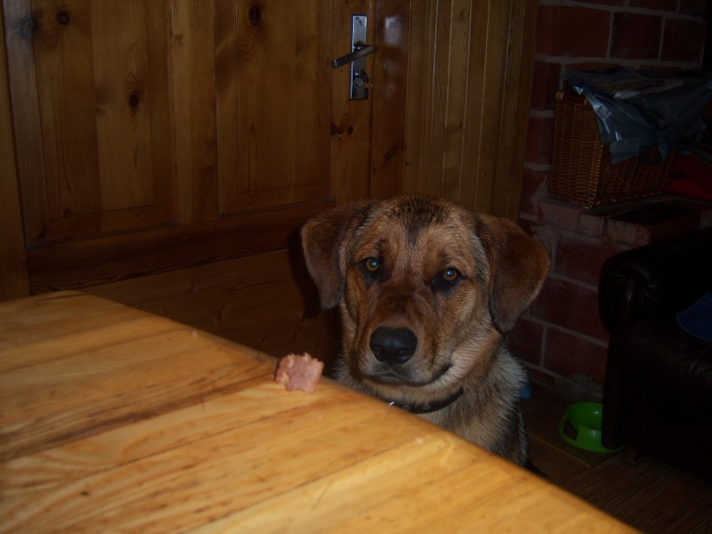 Draudzīgs, klausa komandu "Sēdi" Pie kakla siksnas žetons kaula formā ar telefona numuru un "Upītes" vārds Tobis