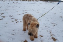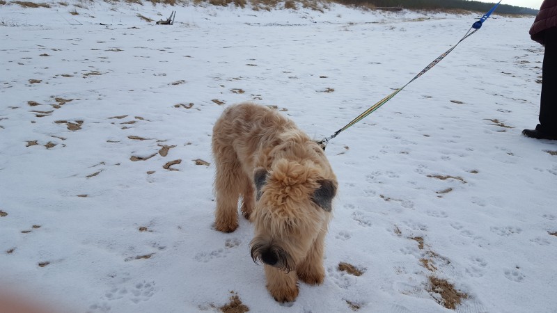 Dzeltens kucēns ar zīdainu spalvu un divām pavadiņām pazudis Lilastes autosstāvvietā pie jūras