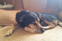 Собака среднего размера, седая мордочка, под одной из подмышек есть шишка.