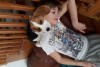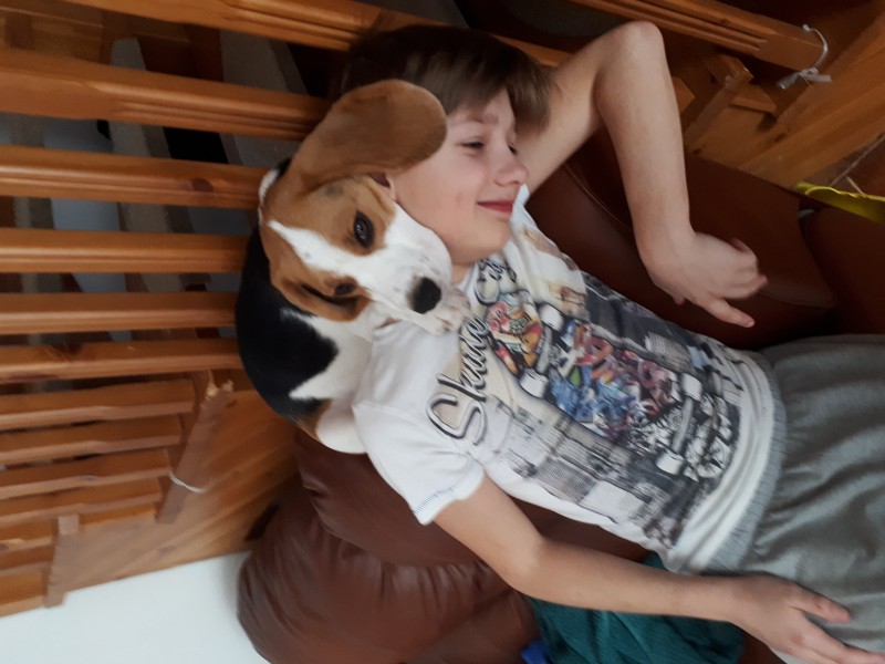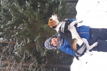 Draudzīgs suns, trīs krāsu ( balts, brūns, melns), vārds DERA.