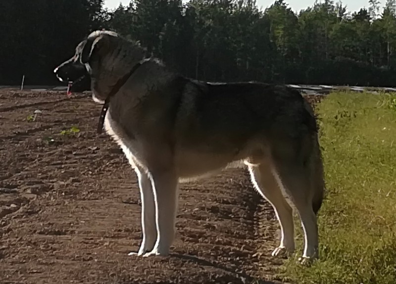 Kaukāzieša un Aļaskas malamuta krustojums, pelēkā krāsā ar vidēji garu spalvu, pusotru gadu vecs, ļoti liels (ap 50kg, muguras augstums gandrīz līdz gurnam), ļoti draudzīgs un miermīlīgs, atsaucas uz vārdu Cēzars.