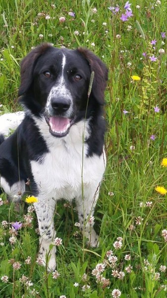 Mugura melna, aste balta, augšā, ausis nokarenas. Krūtis, vēders, kājas baltas, uz kājām melni punkti. Suns čipēts, reģistrēts.