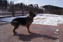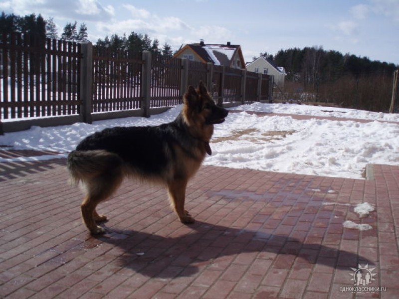 Длиношерстная немецкая овчарка, 11 лет, рыжая с черным, кличка Арта. Без ошейника, жила во дворе частного дома. Сейчас у нее период линьки, лохматая голова, плечи, передние лапы, гладкая спина и поясница, немного лохматые задние лапы