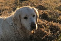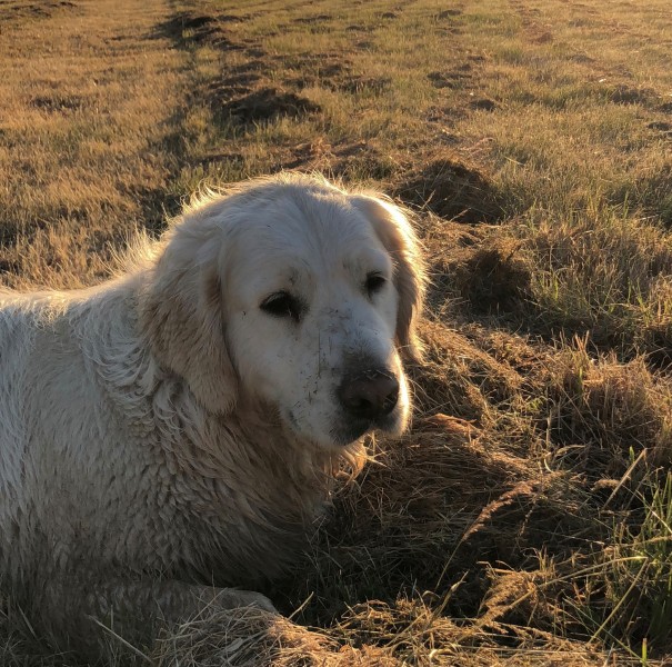 Zeltainais retrīvers, atsaucas uz vārdu Megija, ap kaklu rozā siksniņa ar vārdu.