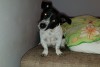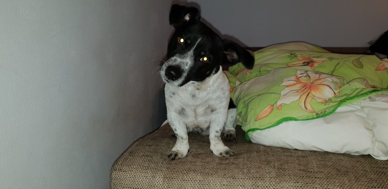 Balts ar melniem plankumiem.Ap kaklu bija zila siksniņa.Astīte nogriezta-īsa.Atsaucas uz vārdu-Garis.
