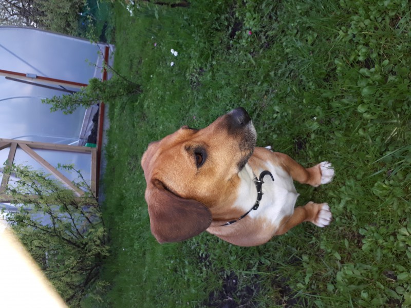 Suns ir draudzīgs, ruds ar baltu astes galu, krūškurvi un ķepām, ap kaklu mena, šaura siksna. Vardā Bonis.