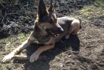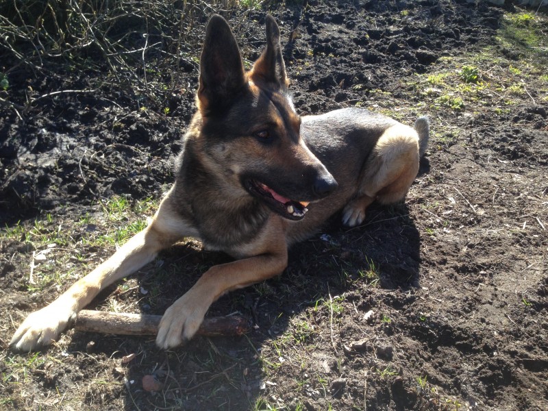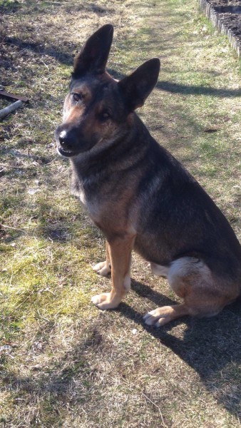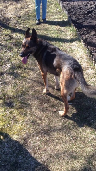 Liels bruns ,ar melnu muguru. Smukas,taisnas ausis. Atsaucas uz Muhtar.