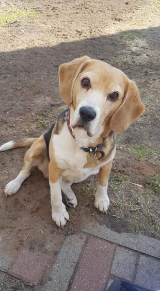 kaklā kuloniņš ar vārdu un tel. Ir čips. Suns pašlaik resnāks kā foto