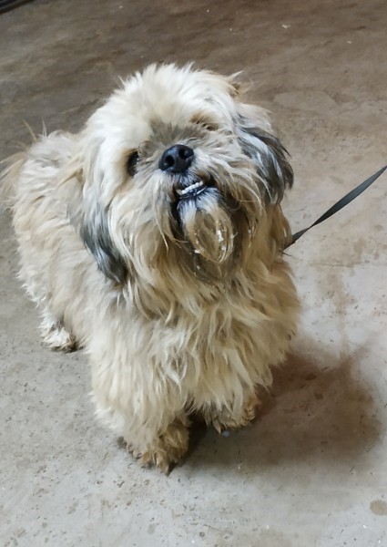 Neliela auguma pelēks.Suns ir draudzīgs var pasaukt klāt atsaucas uz vārda Gufijs, uz kakla ir piekariņš ar telefona numuru un adresi.