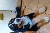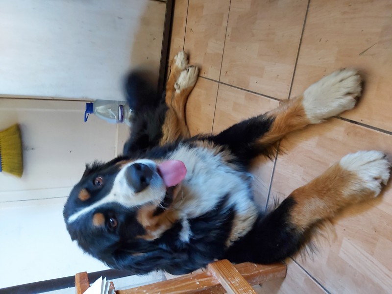 Bernes ganu suns. Nav tīršķirnes. Atsaucas uz vārdu Riko. Aizskrēja pakaļ bukam.