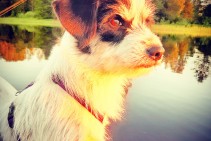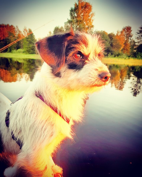 Melnbalta maza suņu meitenīte, ļoti draudzīga. Atsaucās uz vārdu Tifa ap kaklu un krūtīm ir lillā suņa segliņi