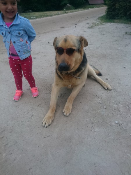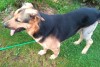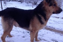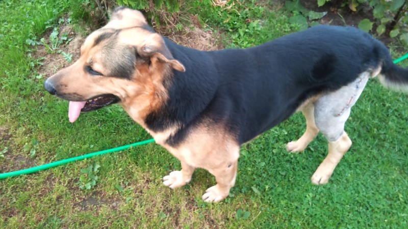 Liela auguma, masīvs suns, liela galva, ausis uz leju, rotveilelera/aitas suņa krust. Ar pakaļkājām redzami klibo.