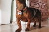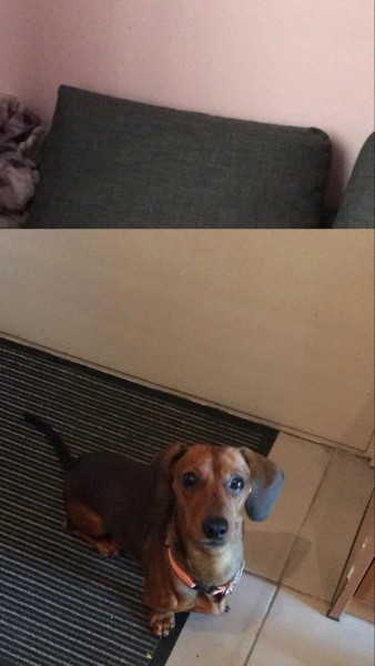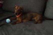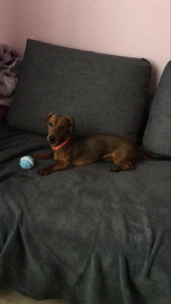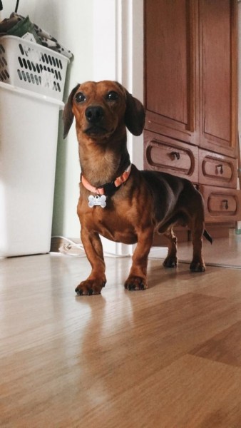 Tumši brūns miniatūras taksītis, tievs. Uz vēdera nesen dzīta spalva, vēders gaiši brūns. Atsaucas uz vārdu Leo.