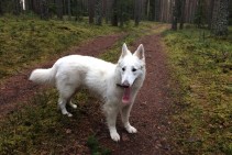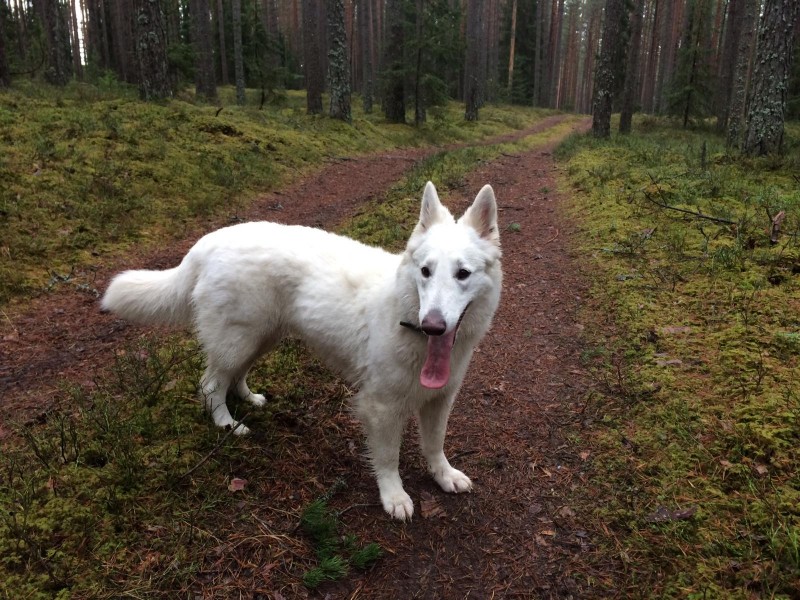 20.01.2020 Tomes mežos pastaigas laikā aizskrējusi baltā Šveices aitu suņa kucīte. Ceļa posmā Tome-Baldone.