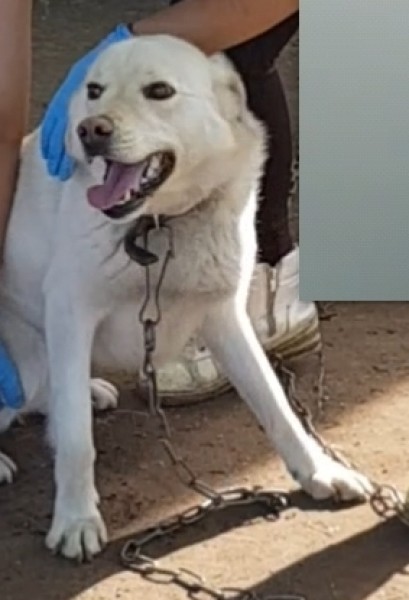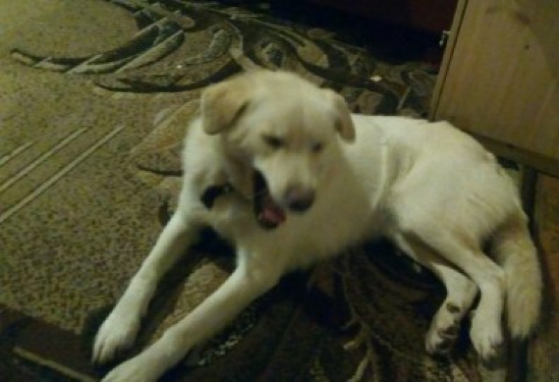 Balts labradora suņu puika.ap kaklu melna siksniņa.videja auguma.atsaucas uz vārdu Rodžers.