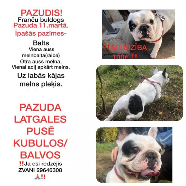 Pazuda Kubulu pagastā 11. martā. Ir aizdomas, ka suns ir nozagts. Puikam vārds ir Bonifācijs\Boņuks. īpašas pazīmes viena auss melnbalta(raiba) otra melna.Ap vienu aci melns pleķis. uz labās ciskas melns pleķis. Agresīvs pret citiem suņiem.