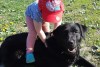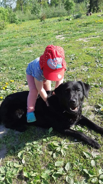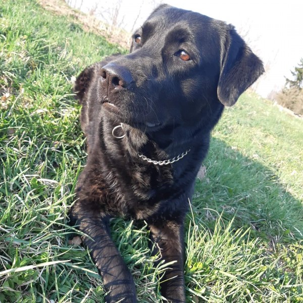 Melns labradors, ļoti draudzīga, ap kaklu sudraba krāsas ķēdīte.
