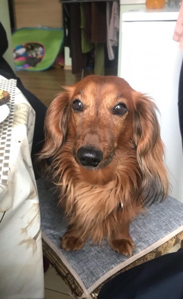 Garspalvainais truša taksītis, brūni rudā krāsā, puika, atsiets un aizvests netālu no Buļļu bāzes dzelzceļa pārbrauktuves