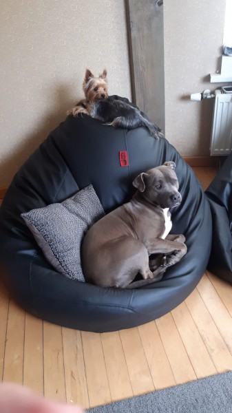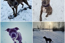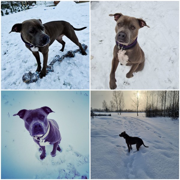 Pelēki brūna stafordšīras terjera un pitbula krustojuma kucīte ar baltu apkaklīti!!!
