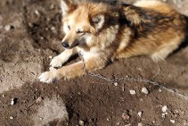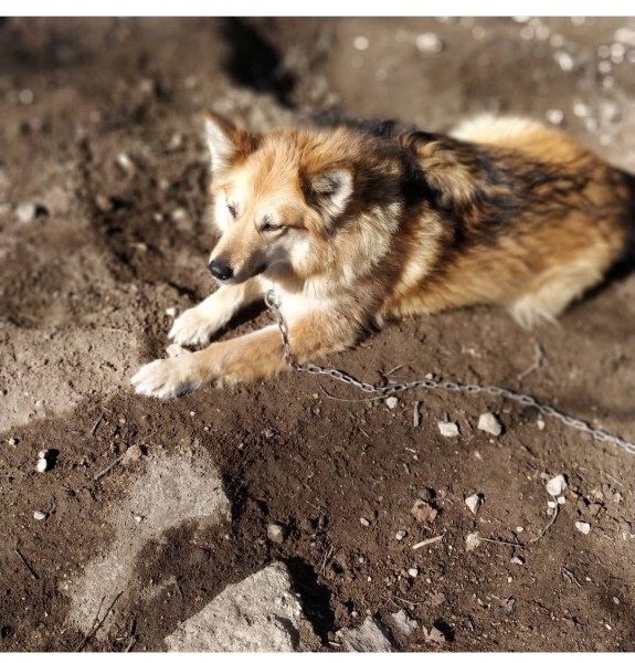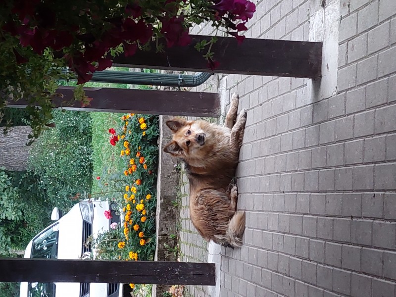 Brūna, bieza spalva, brūnas acis, ļoti draudzīga, izmērā apmēram kā vācu aitu ganu suns.
