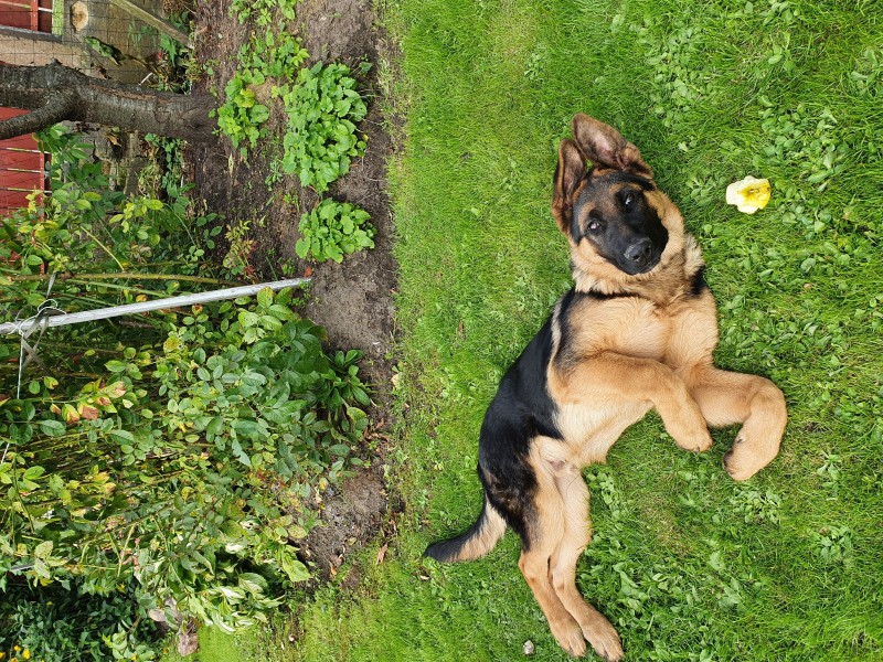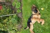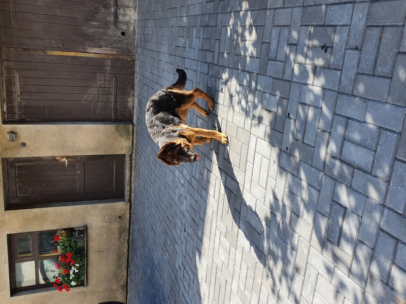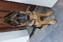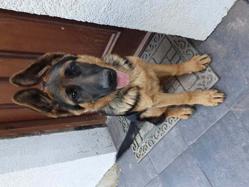 Vācu aitas suņu puika, 6 meneši vecs, tumši brūnā krāsā ar gaiši brūnu audekla kaklasiksnu. Atsaucas uz vārdu Dodž.