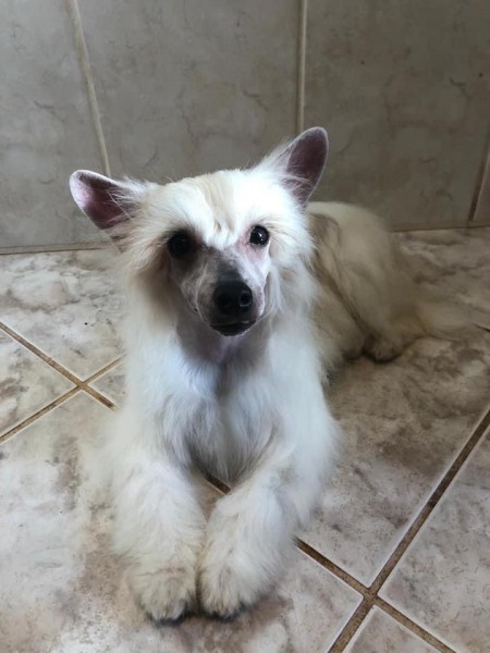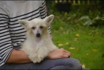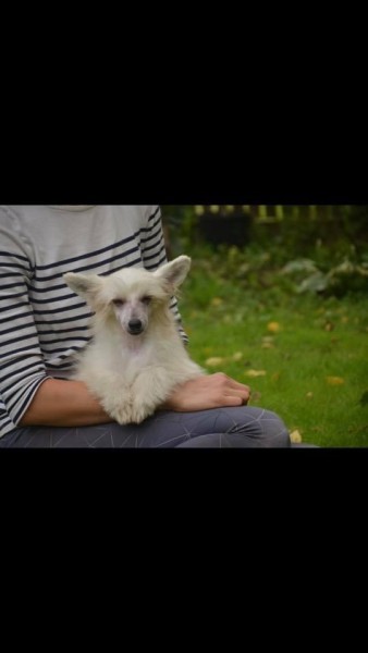 Šķirne- ķīnas cekulainais. Balts kažoks. Ļoti bailīgs. Atsaucas uz vārdu Lucifers.