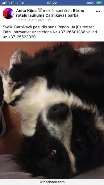 Pazudis Carnikavā Bonderkollija šķirnes suns no 09.07.2022 uz 10.07.2022. Lūdzu atrdēju zvanīt uz norādīto tālruņa numuru.