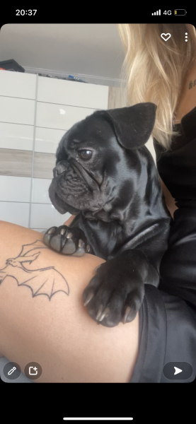 Neliels melns franču buldogs ar zilu apkakli. Sauc Piksel. На груди белая полоса.