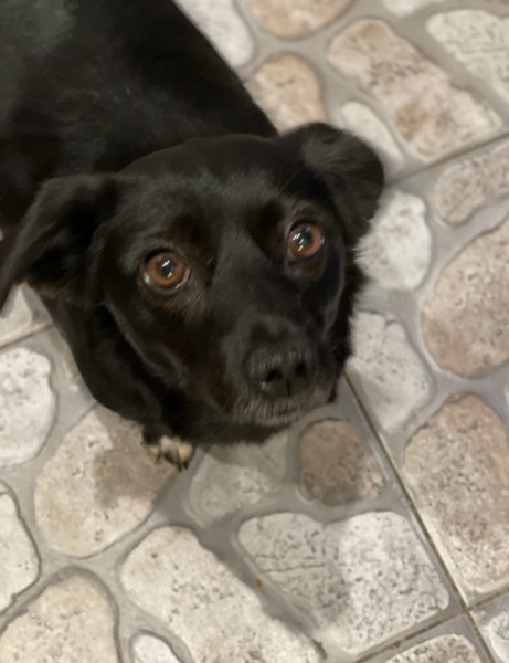 Melna, maza zem kakla pleķis balts, acis brūnas