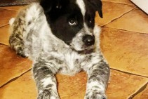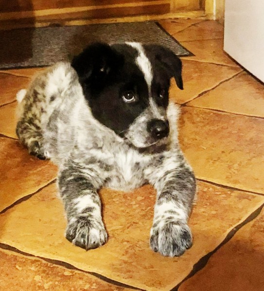 Suņu puika, 5 mēneši, pamatkrāsa balts ar pelēkiem plankumiem, lāsumiem, melna galva , no pieres līdz purniņam balta svītra ar pelēkiem lāsumiem.