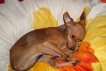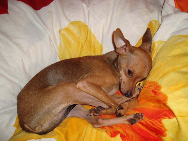 Brūns toj terjers bez kakla siksnas. Atsaucas uz Riči.