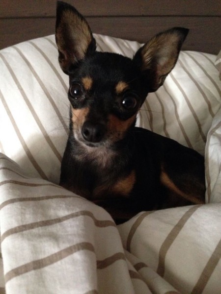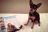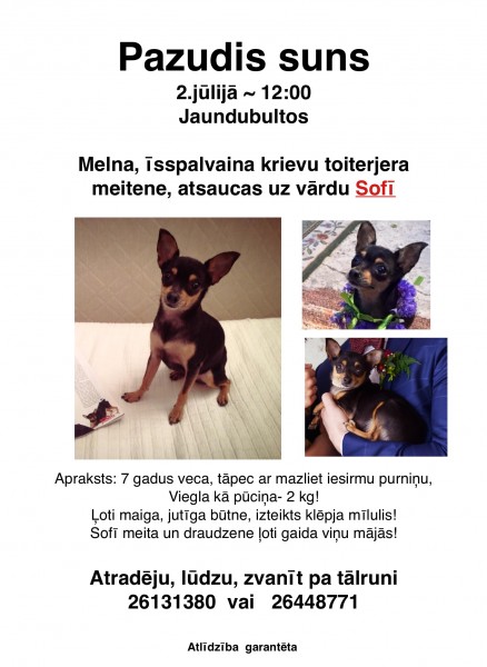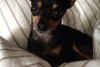 Īsspalvains krievu toiterjers, melns ar brūniem lāsumiem, ļoti maziņa- 2kg svarā.