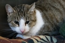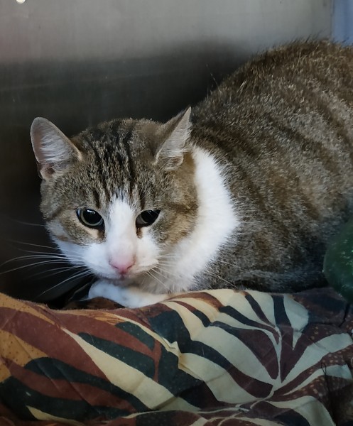 Pelēki svītraina ar baltu, īsspalvaina, nobijusies. Kaķe noķerta Jelgavā, Akadēmijas ielā 2